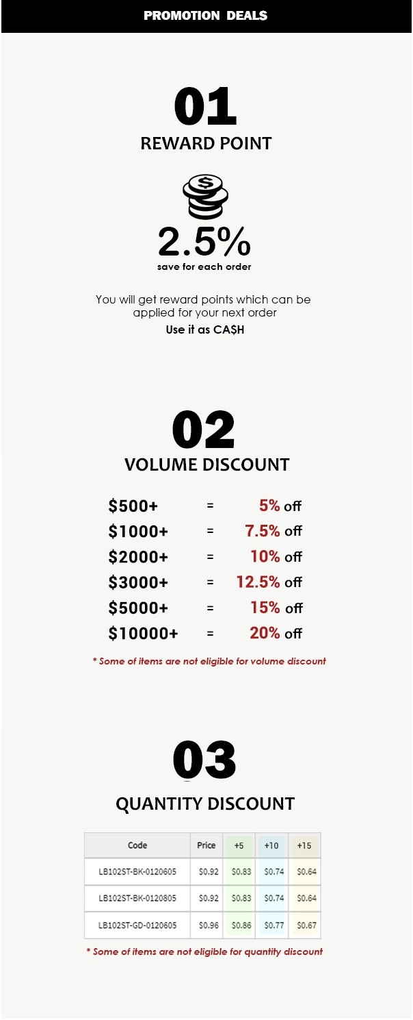 Minimum Purchase Only $50 Free Shipping US (continental) $300* / Intl $700* Reward Points 2.5% Volume discount Tier Discount and more!