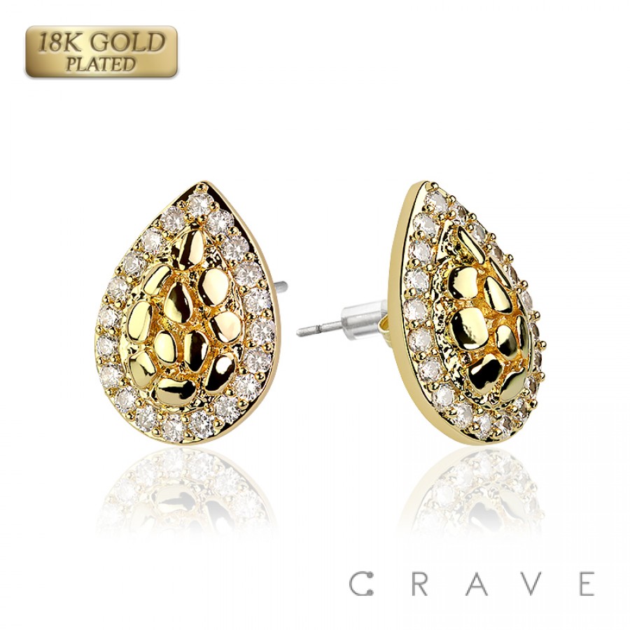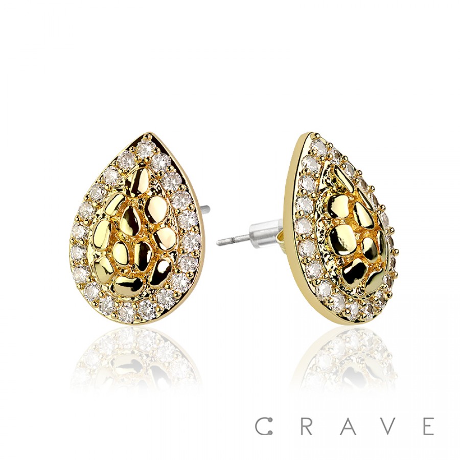 PAIR OF 18K GOLD PLATED MULTI CZ GEMS TEAR DROP INGOT CENTERED NUGGET EARRINGS