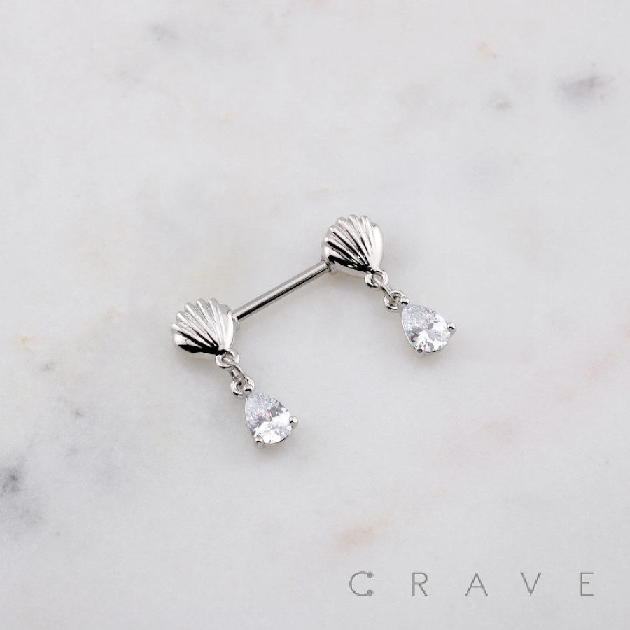 TEARDROP CZ DANGLE SEASHELL 316L SURGICAL STEEL NIPPLE RING
