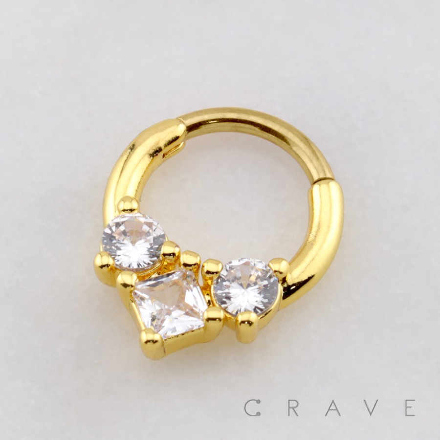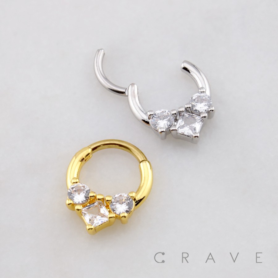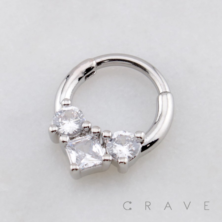 TRIPLE CZ PRINCESS CUT AND ROUND CUT 316L SURGICAL STEEL DAITH SEPTUM HINGED SEGMENT RING