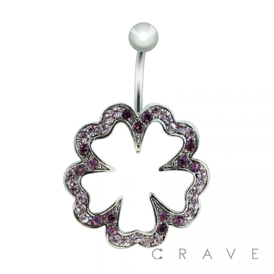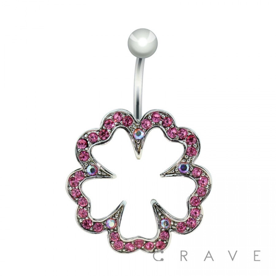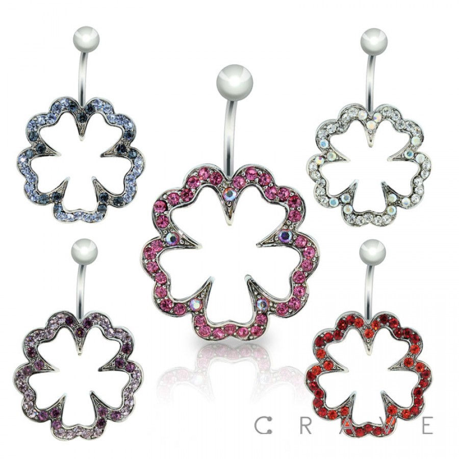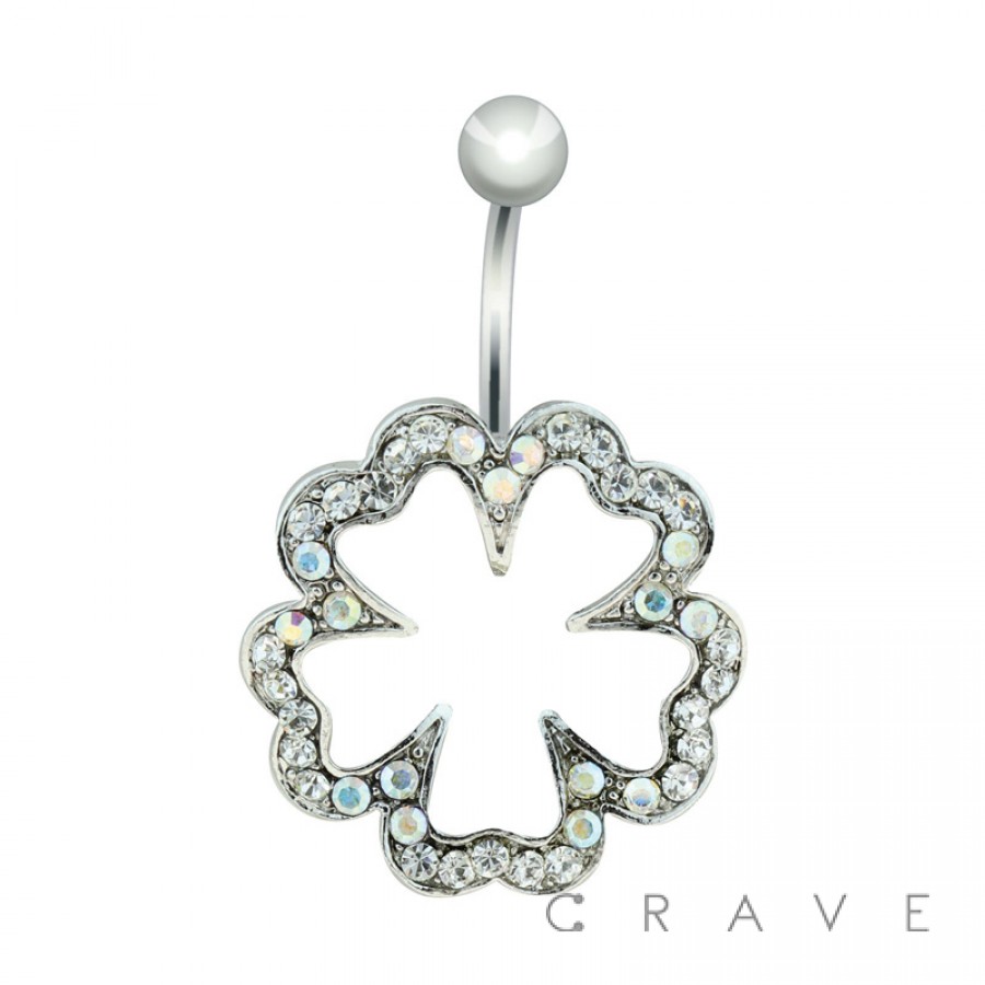 GEM PAVED 5 LEAF CLOVER 316L SURGICAL STAINLESS SWIVEL NAVEL RING