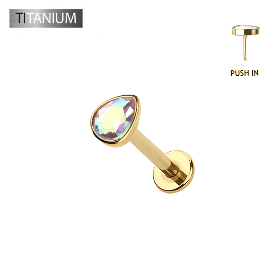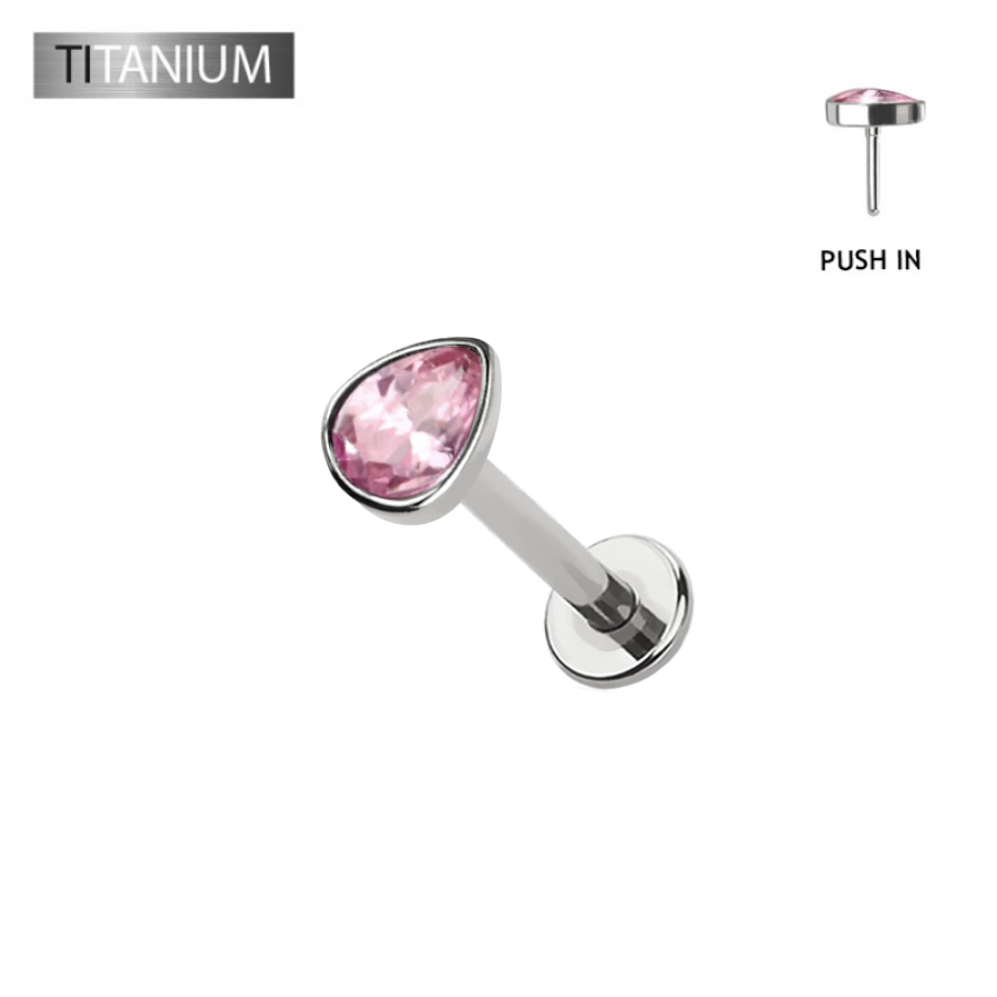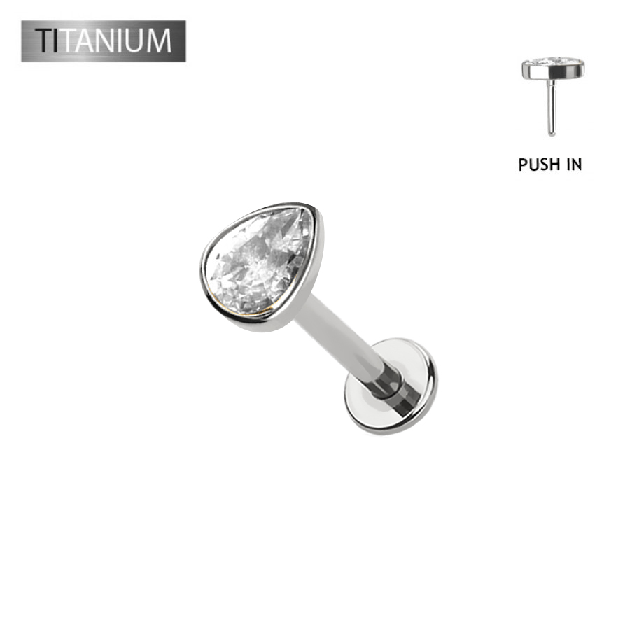 IMPLANT GRADE TITANIUM THREADLESS PUSH IN BEZEL SET TEARDROP CZ TOP LABRET