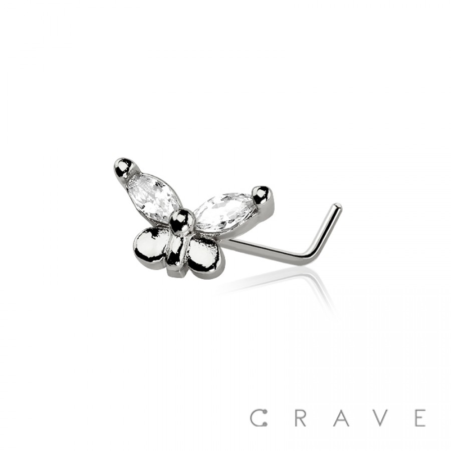 CZ PRONG BUTTERFLY 316L SURGICAL STEEL L SHAPE NOSE RING