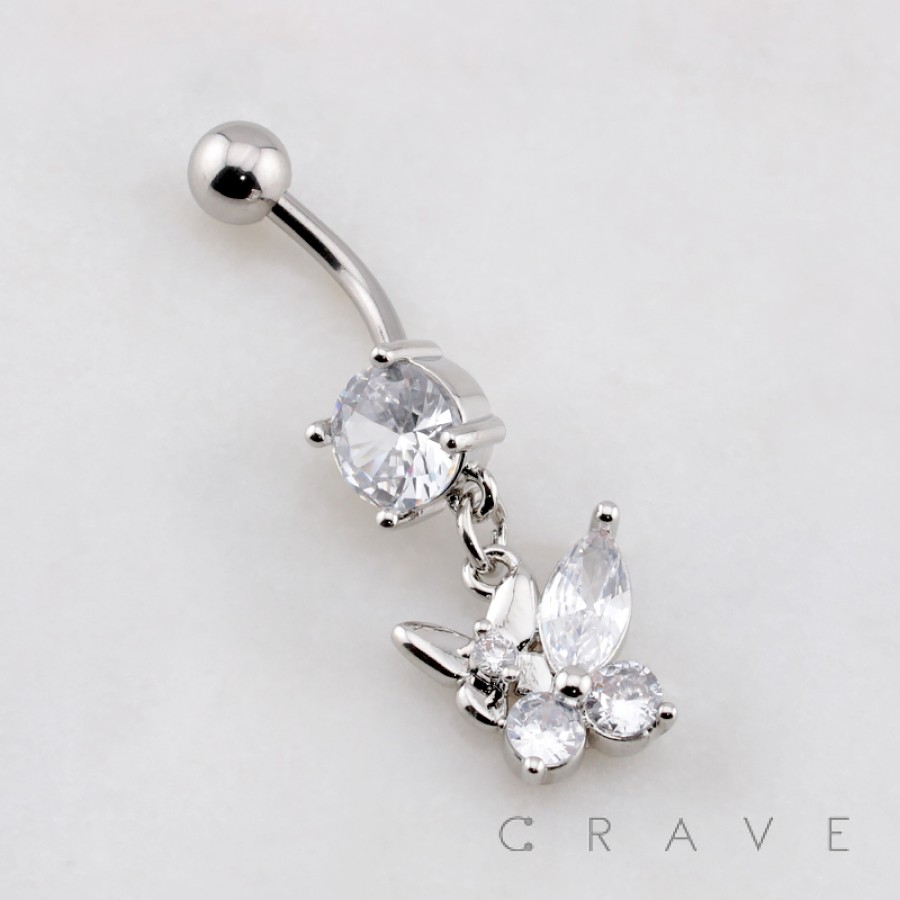 DOUBLE BUTTERFLY MULTI CZ BELLY BUTTON NAVEL RING 316L SURGICAL STEEL