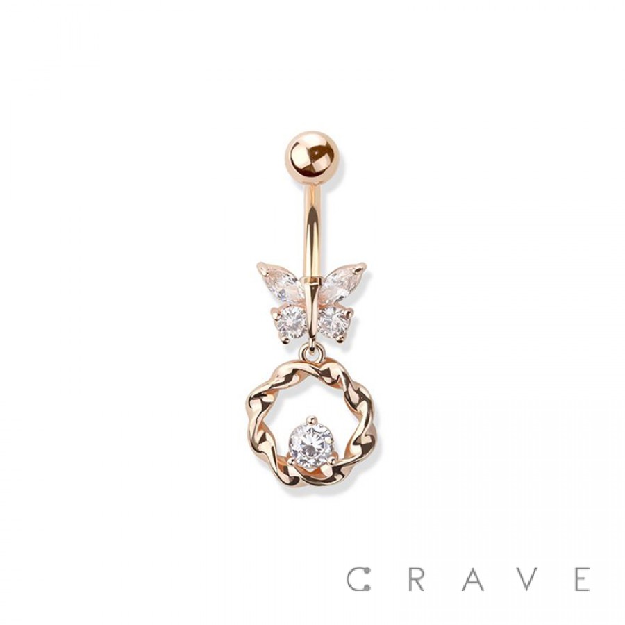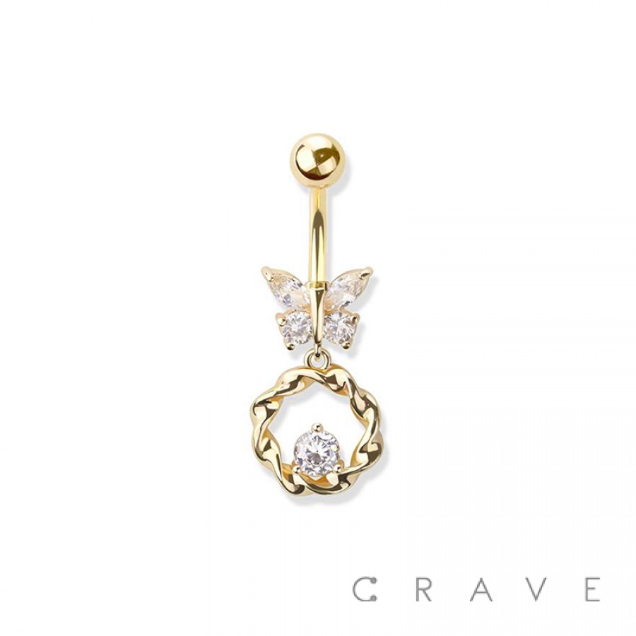GEM PAVED BUTTERFLY 316L SURGICAL STEEL CZ CENTERED LOOP DANGLE NAVEL RING
