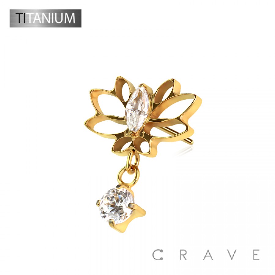 IMPLANT GRADE TITANIUM THREADLESS PUSH IN CZ LOTUS FLOWER WITH ROUND CZ DANGLE TOP PART